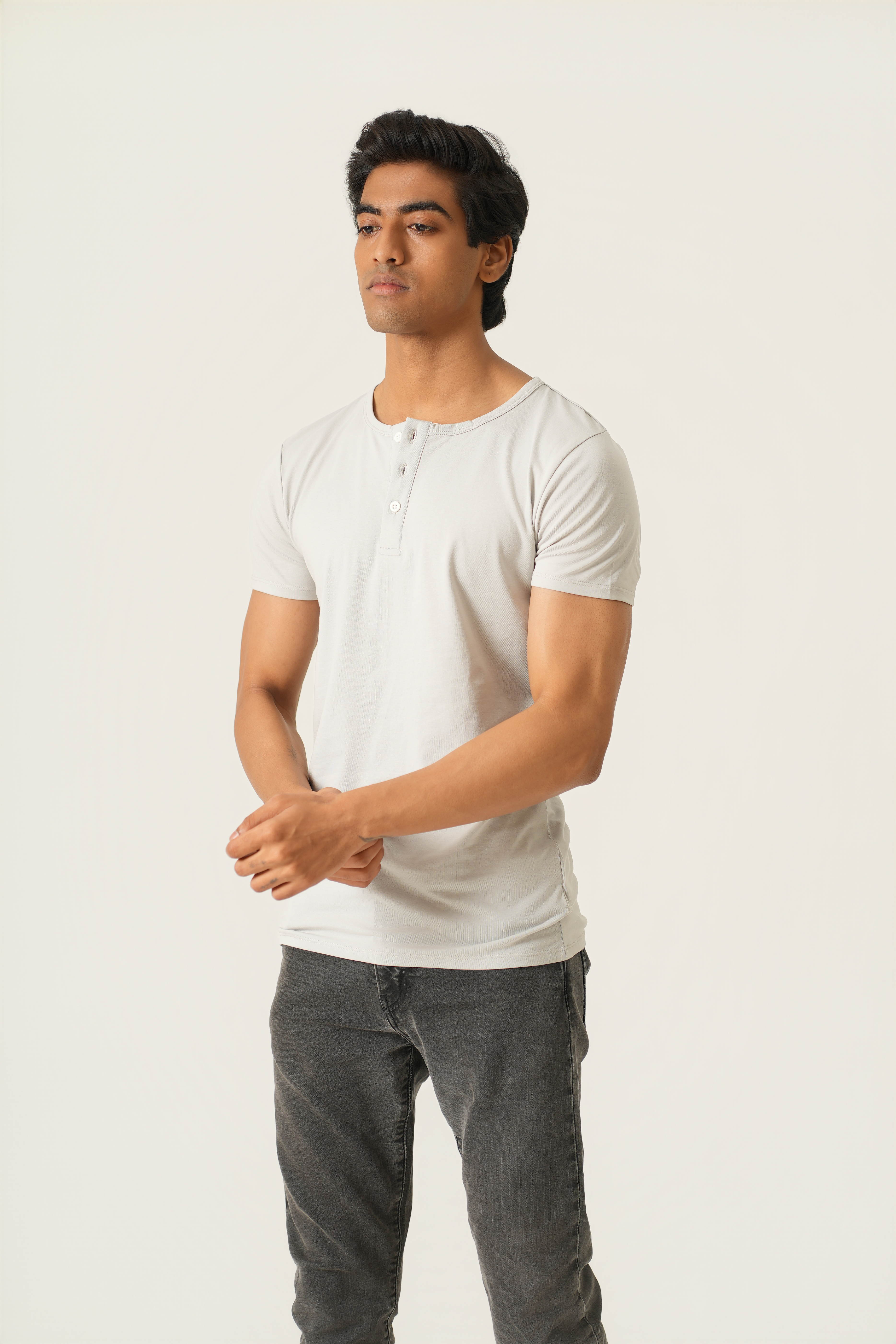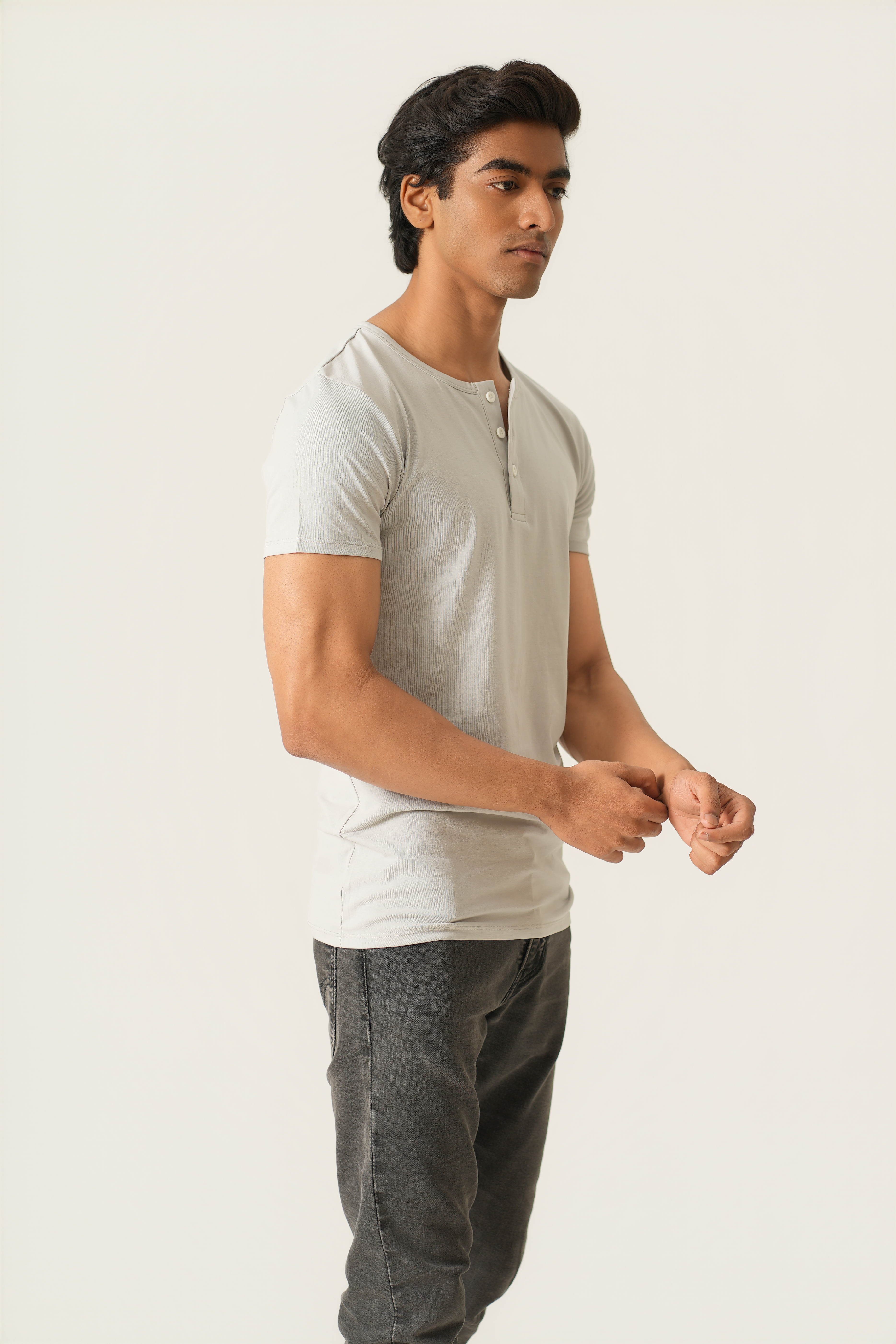 Sleek Fit- Henley Neck Short Sleeve- Granite Gray